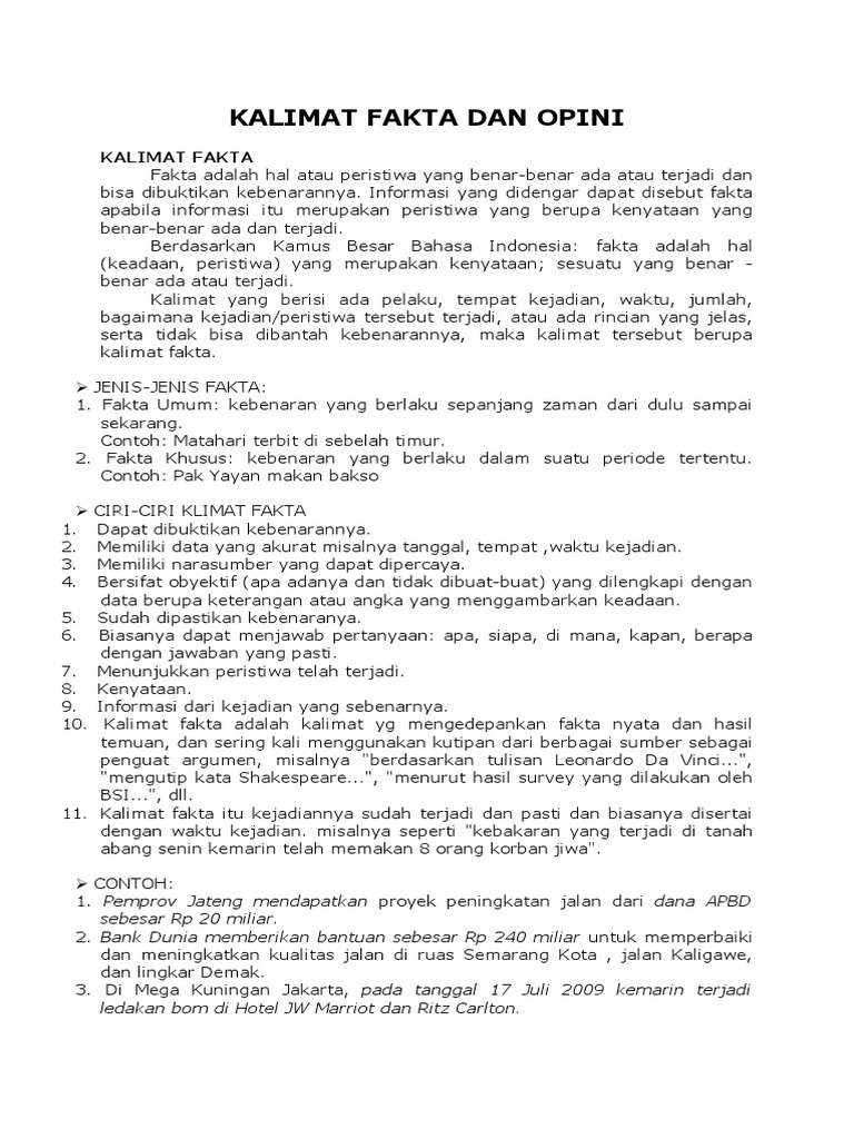 Fakta Dan Opini from imgv2-2-f.scribdassets.com Karena sebagai mana yang kita tahu. Kalimat opini akan berganti status menjadi kalimat fakta apabila kalimat tersebut dapat dibuktikan kebenarannya. Kalimat opini bersifat subjektif, yang biasanya diikuti pendapat, saran, dan uraian yang menjelaskan pandangan penulis terhadap suatu masalah atau kejadian. Selain banjir, daerah perbukitan juga mengalami longsor sehingga banyak jalan yang terpaksa ditutup karena khawatir membahayakan masyarakat yang melintasi jalan tersebut. Format yang ditampilkan adalah menampilkan contoh kalimat tidak efektif dan pembenarannya sehingga menjadi kalimat efektif, sebagai berikut ini. Siapa yang tidak kenal dengan bencana banjir? Kalimat opini umum adalah kalimat opini yang pendapat atau gagasannya diakui banyak orang atau semua orang. Sedangkan, kalimat opini merupakan kalimat yang berisi tentang pandangan ataupun pendapat seseorang terhadap sesuatu, yang belum tentu itu kampus ugm terletak di yogyakarta.